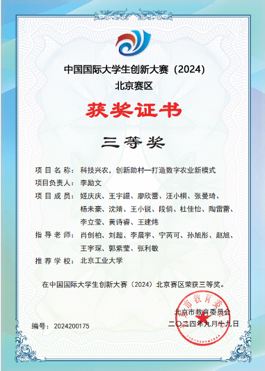 李励文、姬庆庆、王宇譞、廖欣蕾、汪小桐、张曼琦、杨未豪、沈婧、王小锐、段俏、杜佳怡、陶雷蕾、李立莹、黄诗睿、王建炜《科技兴农、创新助村—打造数字农业新模式》荣获北京赛区三等奖(指导教师:肖创柏、刘超、李晨宇、宁芮可、孙旭彤、赵旭、王宇琛、郭紫莹、张利敏)
