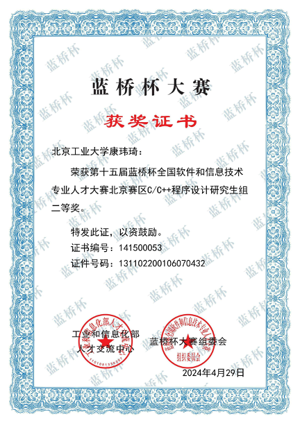 康玮琦荣获北京赛区C/C++程序设计研究生组二等奖 指导老师 吕庚育