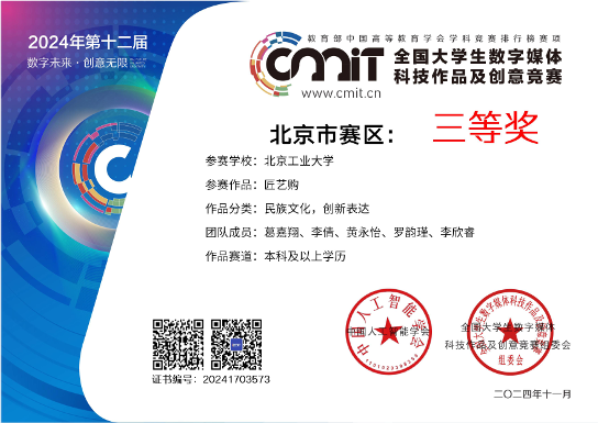 葛嘉翔、李倩、黄永怡、罗韵瑾、李欣睿同学《匠艺购》项目荣获北京赛区三等奖