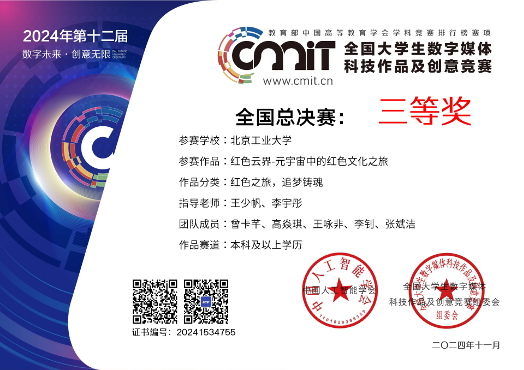 曾卡芊、高焱琪、王咏非、李钊、张斌洁同学《红色云界-元宇宙中的红色文化之旅》项目荣获国家三等奖。(指导教师:王少帆,李宇彤)