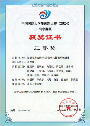 李菁坤、姬庆庆、王辰心、马佳欣、高艺萍、汪小桐、廖欣蕾、王宇譞、张曼琦、李立莹、张虞、董琦、段俏、常宇欣、黄诗睿《智慧冷库仓储AGV路径优化管理系统设计》荣获北京赛区三等奖(指导教师:肖创柏、李晨宇、刘超、赵旭、孙旭彤、郭紫莹)