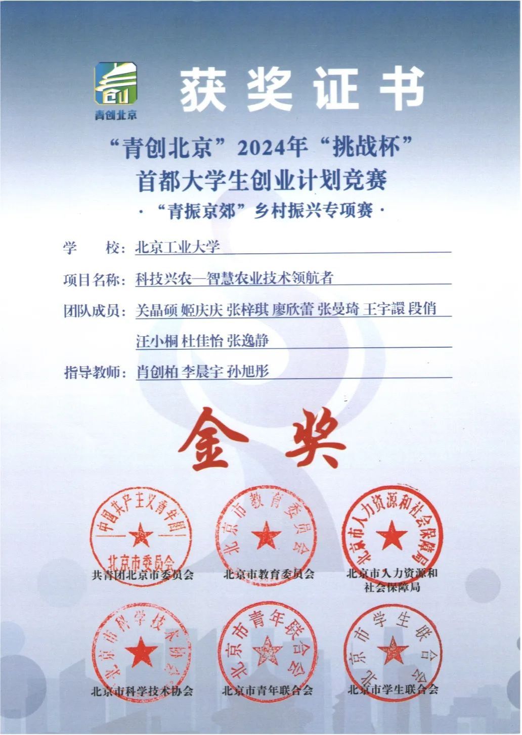 关晶硕、姬庆庆、张梓琪、廖欣蕾、张曼琦、王宇譞、段俏、汪小桐、杜佳怡、张逸静《科技兴农—智慧农业技术领航者》荣获“青振京郊”乡村振兴专项赛 金奖(指导教师:肖创柏、李晨宇、孙旭彤)