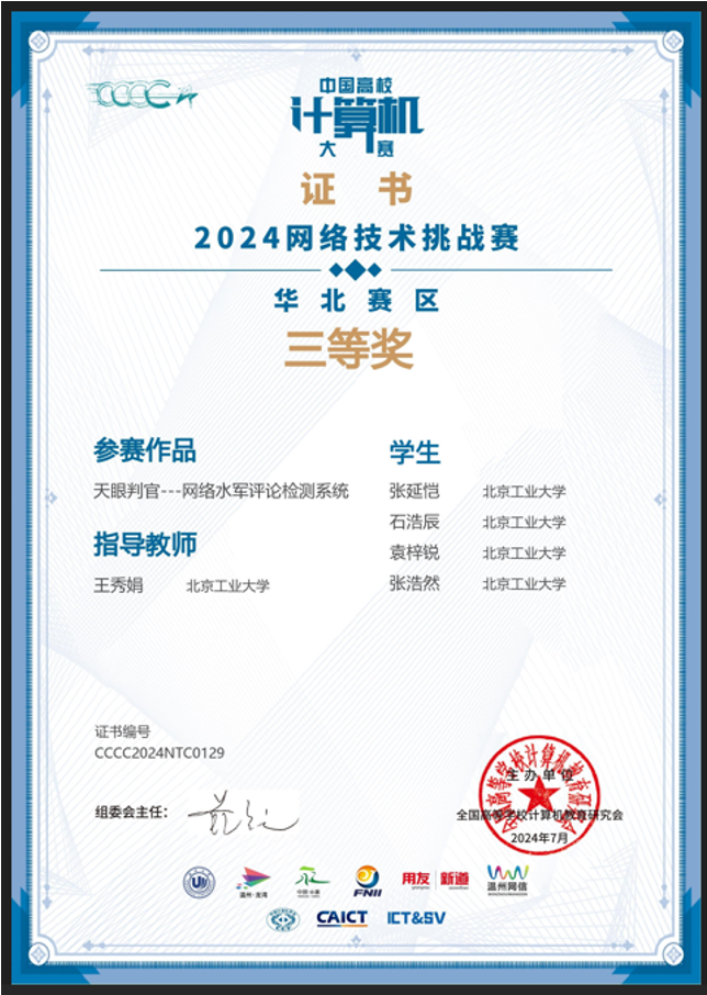 张延恺、石浩辰、袁梓悦、张浩然作品《天眼判官——网络水军评论检测系统》获得华北赛区三等奖