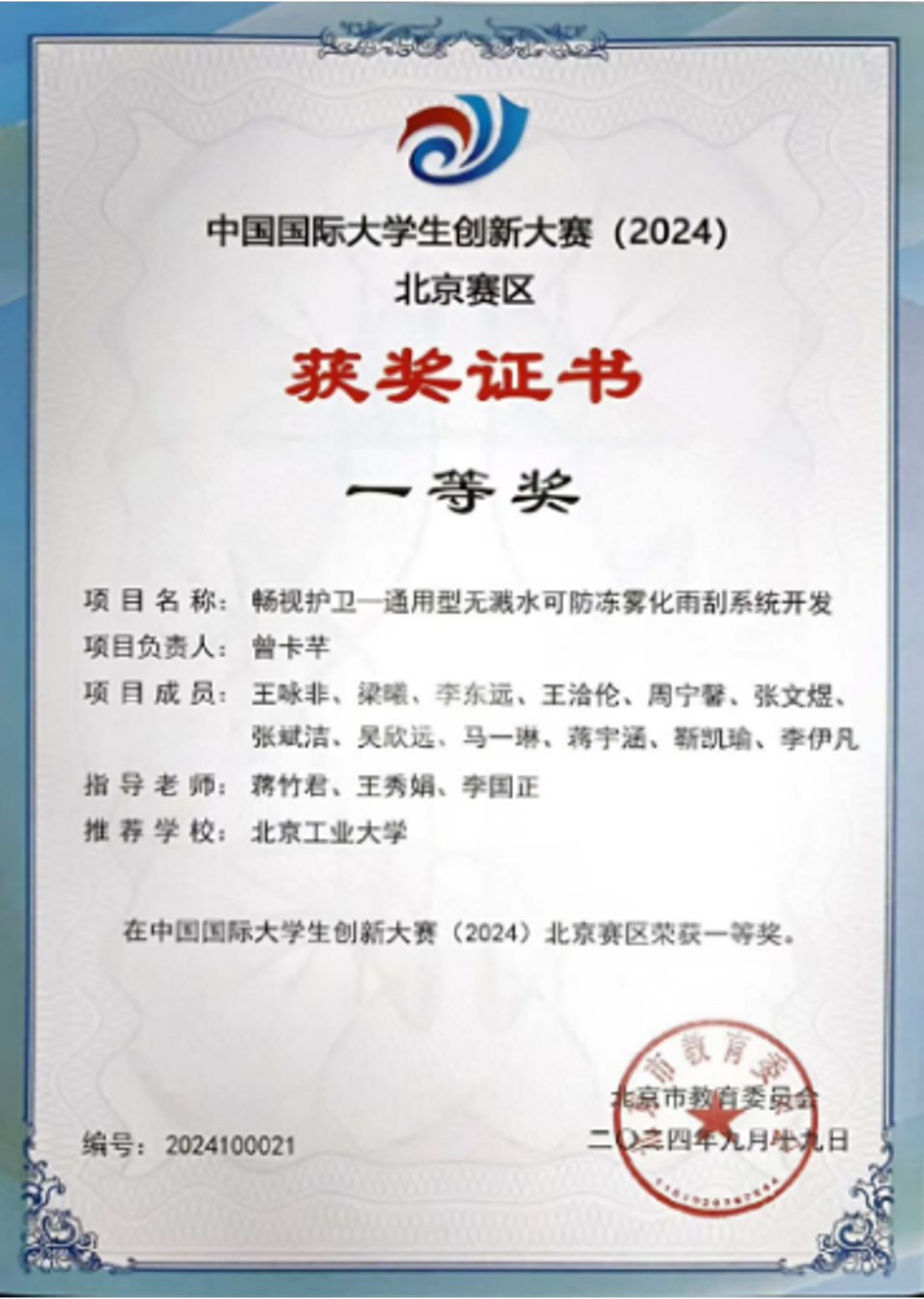 曾卡芊、王咏非、梁曦、李东远、王洽伦、周宁馨、张文煜、张斌洁、吴欣远、马一琳、蒋宇涵、靳凯瑜、李伊凡《畅视护卫一通用型无溅水可防冻雾化雨刮系统开发》荣获北京赛区一等奖(指导教师:蒋竹君、王秀娟、李国正)