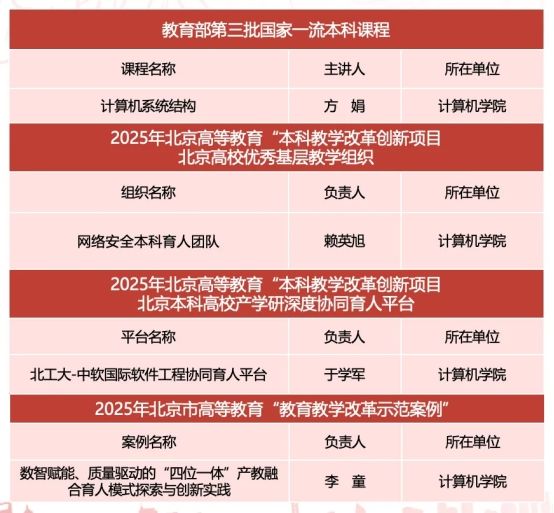 课程建设再攀高峰:方娟主讲的《计算机系统结构》入选教育部第三批国家级一流本科课程,为专业教学质量提升筑牢优质课程根基。