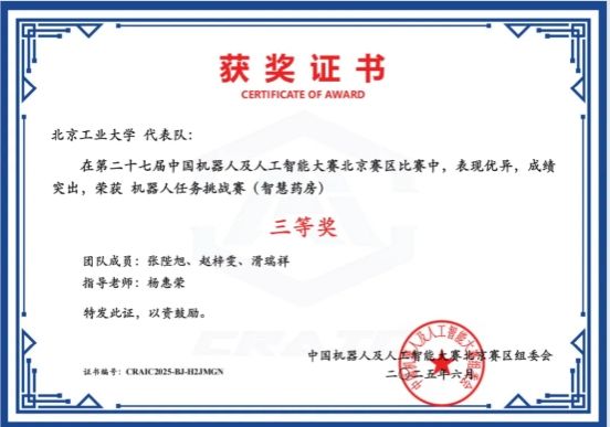 2025年6月,张陛旭、赵梓雯、滑瑞祥在第二十七届中国机器人及人工智能大赛北京赛区中,荣获机器人任务挑战赛(智慧药房)三等奖(指导教师:杨惠荣)