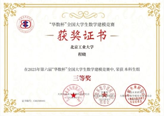 2025年8月,程晓在2025年第六届“华数杯”全国老员工数学建模竞赛中,荣获本科生组三等奖。