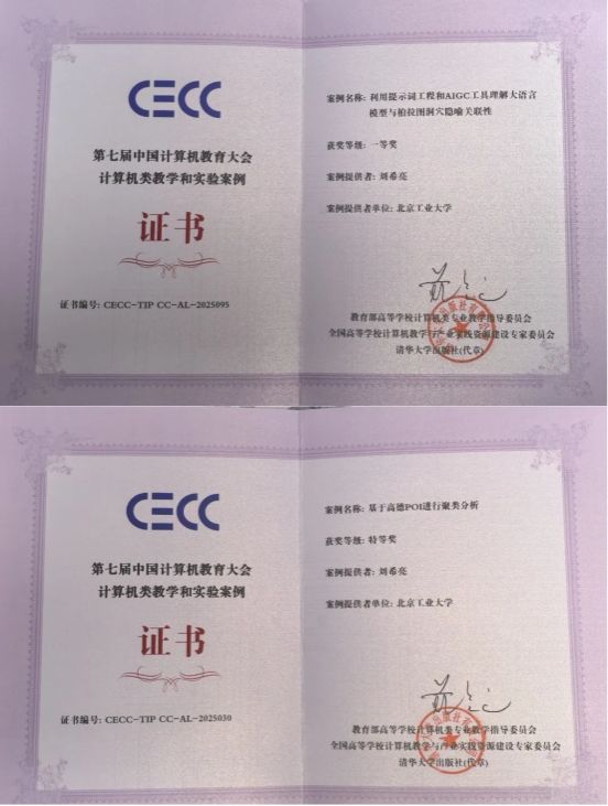 2025年11月,刘希亮荣获第七届中国计算机教育大会计算机类教学和实验案例一等奖(利用提示词工程和AIGC工具理解大语言模型与柏拉图洞穴隐喻关联性),荣获第七届中国计算机教育大会计算机类教学和实验案例特等奖(基于高德POI进行聚类分析)。