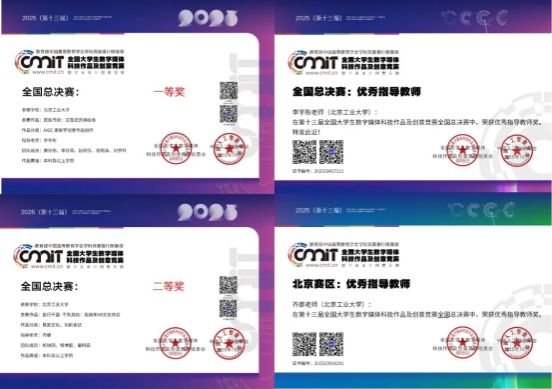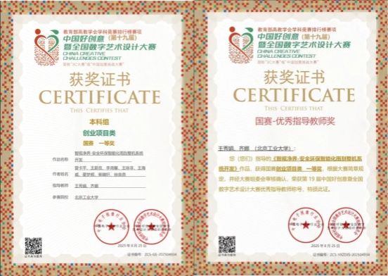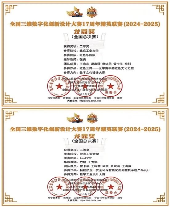 2025年7月,在全国三维数字化创新设计大赛获得全国总决赛二等奖、三等奖各1项,北京赛区特等奖2项,一等奖1项。