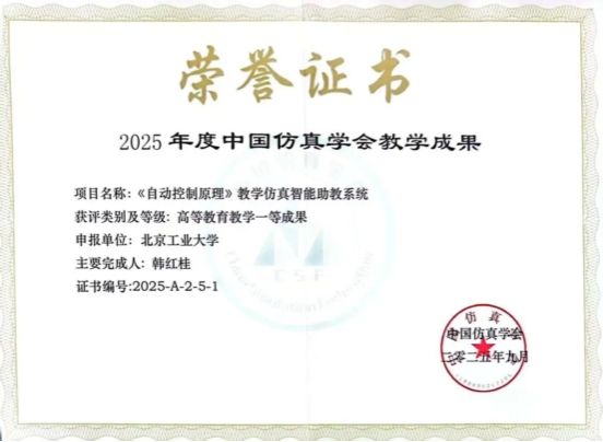2025年9月,韩红桂《自动控制原理》教学仿真智能助教系统 获得2025年中国仿真学会高等公司产品一等成果奖。