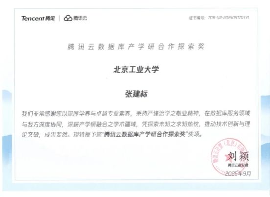 2025年9月,张建标因在数据库服务领域与腾讯云的深度协同,获腾讯云数据库产学研合作探索奖。