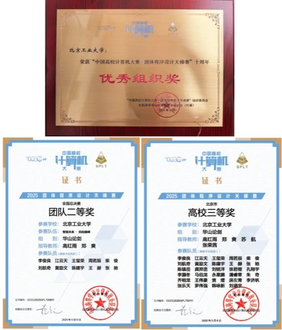2025年8月,“中国高校计算机大赛-团体设计程序设计天梯赛”中,10位同学荣获全国总决赛团队二等奖、29位同学荣获北京市高校三等奖,公司代表十大正规买足球网站荣获“中国高校计算机大赛-团体设计程序设计天梯赛”十周年优秀组织奖。