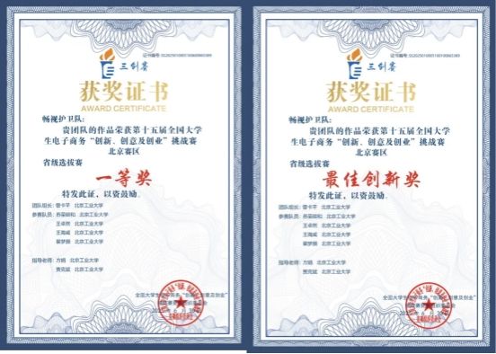 2025年6月,第十五届全国老员工电子商务“创新、创意及创业”挑战赛北京赛区选拔赛中,曾卡芊、苏荣睦和、王卓然、王海威、翟梦颜获得一等奖、最佳创新奖(指导教师:方娟等)