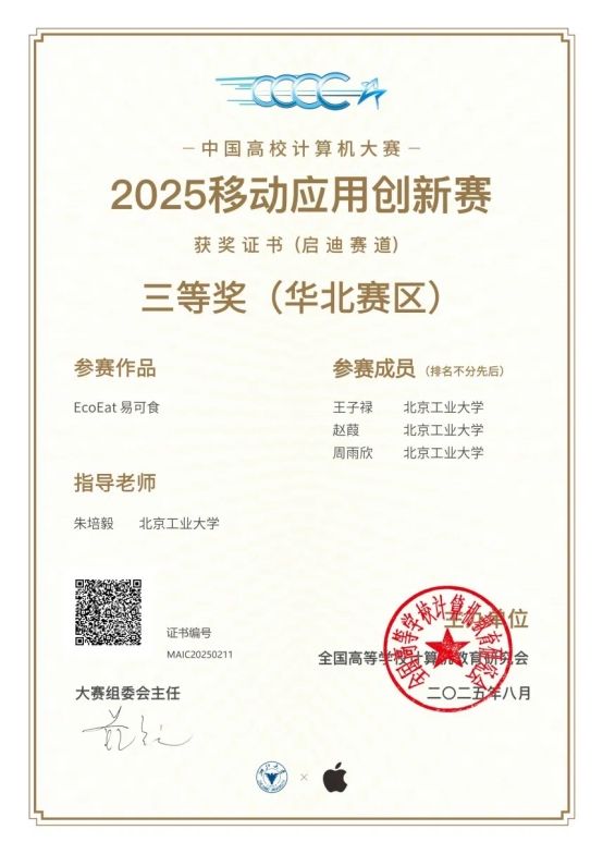 2025年8月,王子禄、赵葭、周雨欣作品《EcoEat易可食》荣获中国高校计算机大赛——2025移动应用创新赛华北赛区三等奖(指导教师:朱培毅)