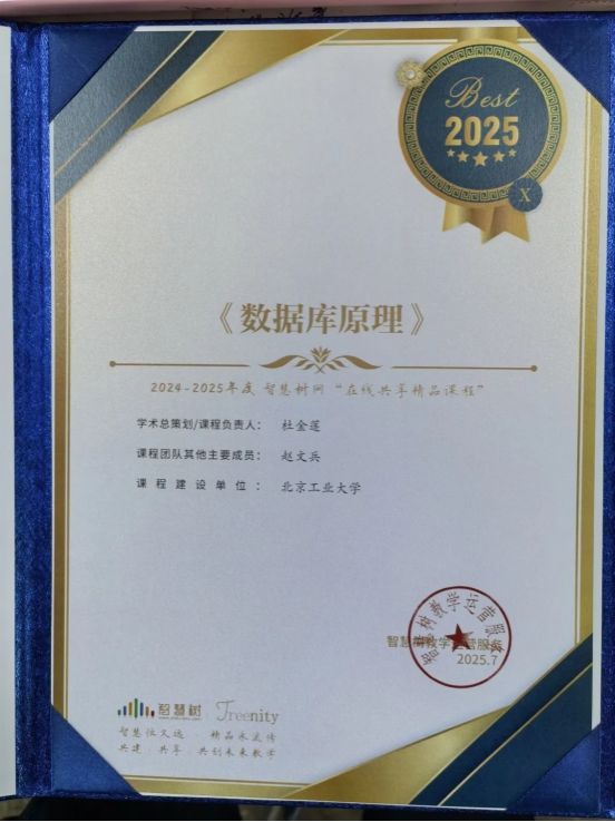 2025年7月,杜金莲、赵文兵主持建设的在线课程《数据库原理》获评2024-2025年度智慧树网“在线共享精品课程”。该课程于2022年上线运营,目前为止已被41所公司选用,累计选课人数达9400多人。