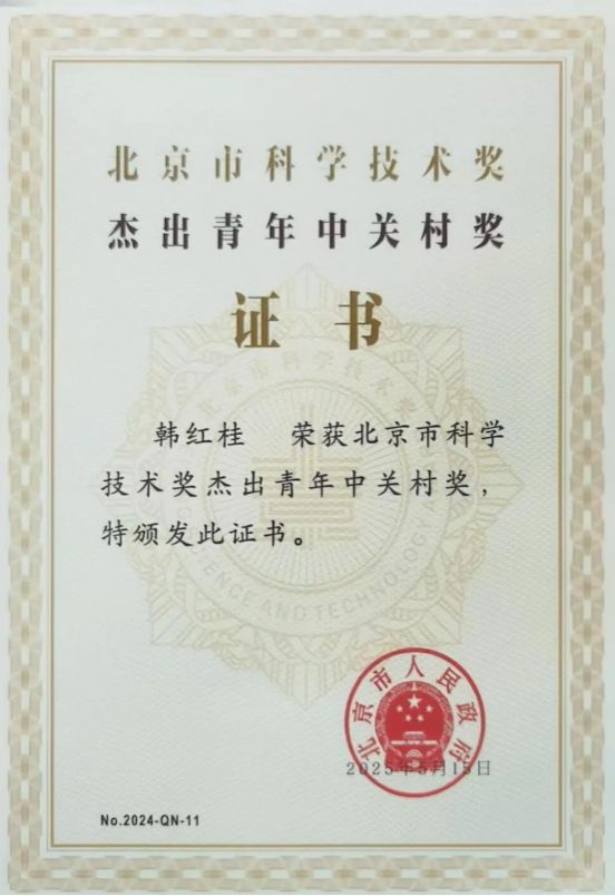 2025年5月,韩红桂荣获北京市人民政府颁发的北京市科学技术奖杰出青年中关村奖。