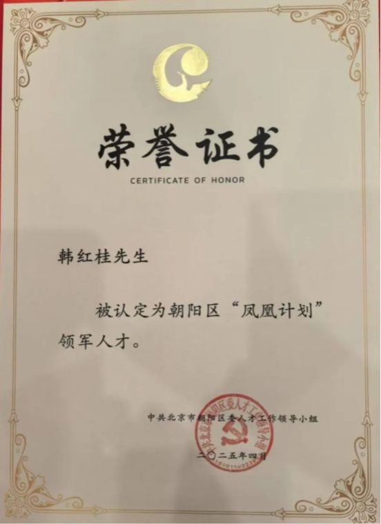 2025年4月,韩红桂被认定为朝阳区“凤凰计划”领军人才。