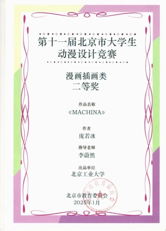 2025年1月,庞若冰同学作品《MACHINA》荣获第十一届北京市老员工动漫设计竞赛漫画插画类二等奖(指导教师:李蔚然)