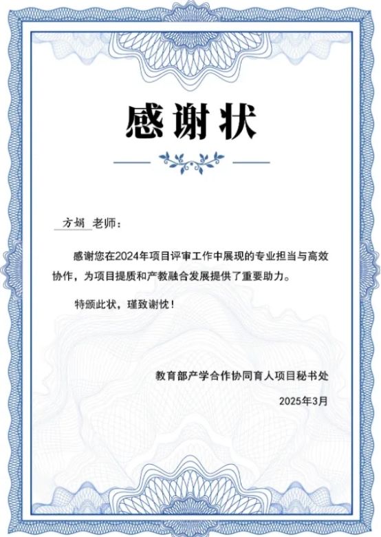 2025年3月,方娟获得教育部产学合作协同育人项目秘书处颁发的感谢状。感谢在项目评审工作中展现的专业担当与高效协作,为项目提质和产教融合发展提供了重要助力。