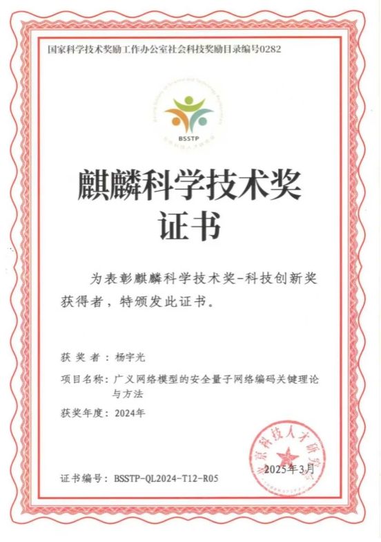 2025年3月,杨宇光参与的《广义网络模型的安全量子网络编码关键理论与方法》项目获北京科技人才研究所2024年度麒麟科学技术奖——科技创新奖。