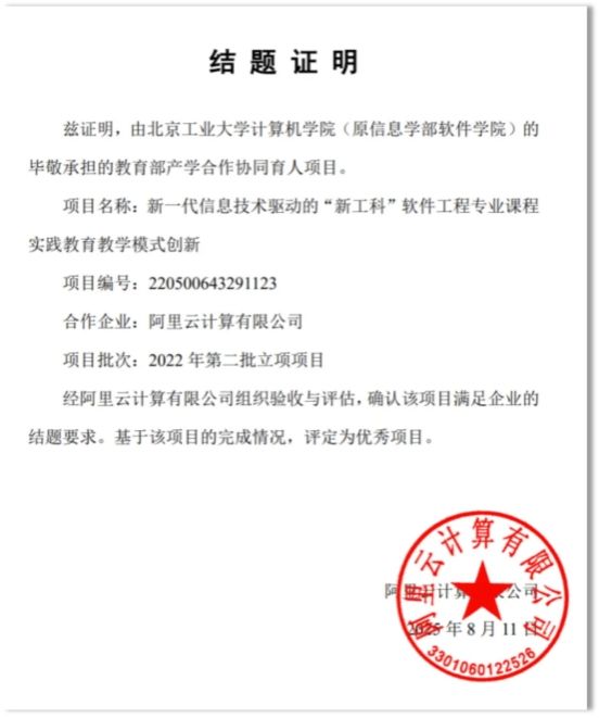 2025年8月,毕敬承担的教育部产学合作协同育人项目“新一代信息技术驱动的“新工科”软件工程专业课程实践公司产品模式创新”,经验收与评估,评定为优秀项目。