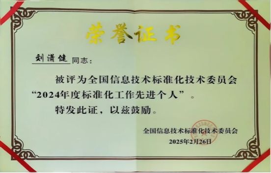 2025年2月,刘潇健被评为全国信息技术标准化技术委员会2024年度标准化工作先进个人。